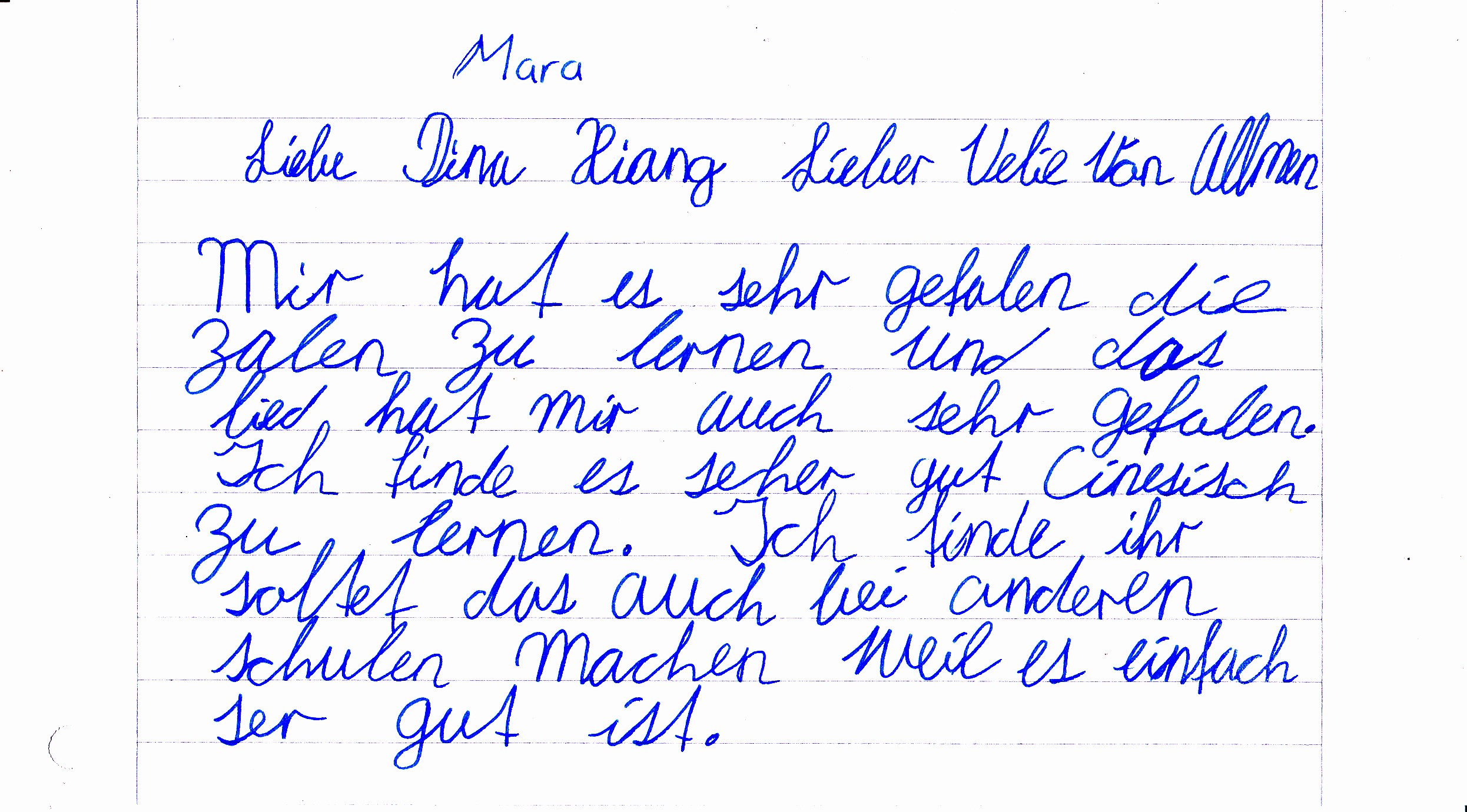 Vor einigen Jahren fand Dinas Abschlusspraktikum als Chinesisch Lehrerin in der Schweiz statt. Ihre Universität gab grünes Licht für unser Angebot Chinesisch mit Musik und so kamen alle Kinder und Jugendlichen im Lauterbrunnental in den Genuss von verspielten Unterrichtsstunden und einer echten Begegnung mit der chinesischen Kultur.