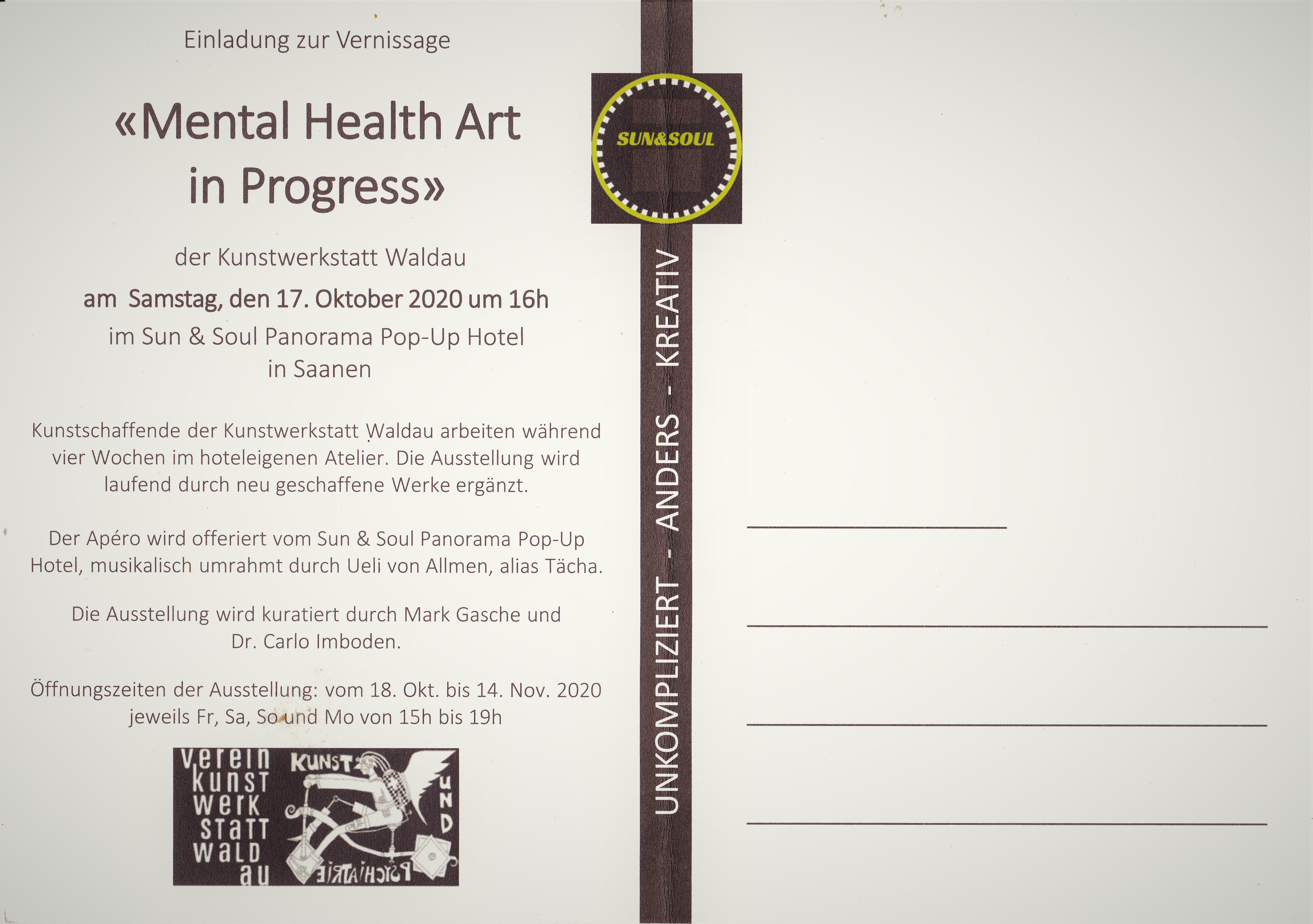 Am Samstag, 17. Oktober 2020 spielte und sang ich an der Vernissage der Ausstellung "Mental Health Art in Progress" im Sun & Soul Panorama Pop-Up Hotel in Saanen.
